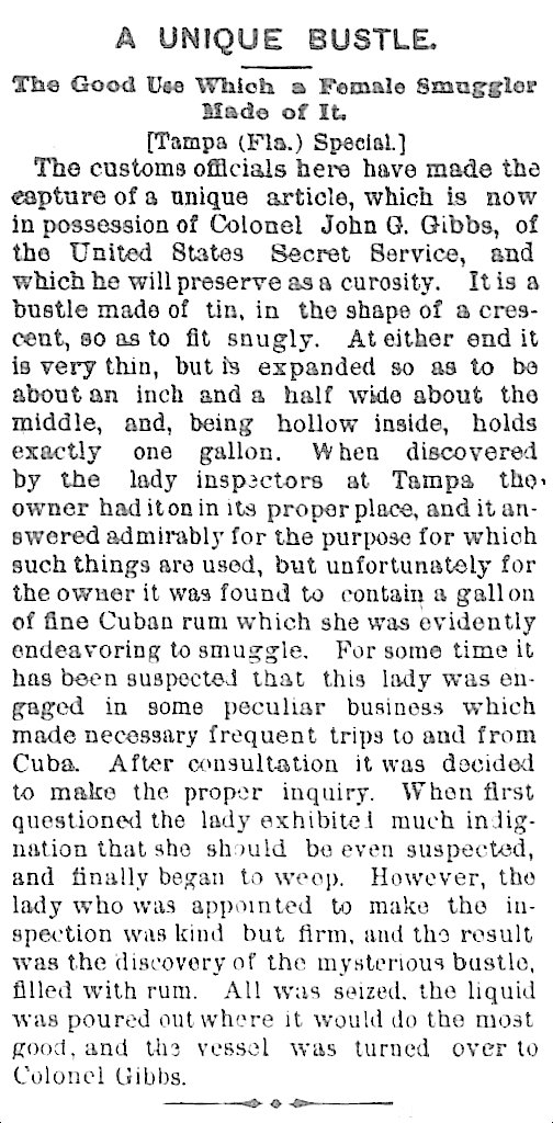 Tampa, Fla., Dec. 20 – The customs officials here have made the capture of a unique article, which is now in possession of Colonel John G. Gibbs, of the United States Secret Service., and which he will preserve as a curiosity. It is a bustle made of tin, in the shape of a crescent, so as to fit snugly. At either end it is very thin, but is expanded so as to be about an inch and a half wide about the middle, and, being hollow inside, holds exactly one gallon.