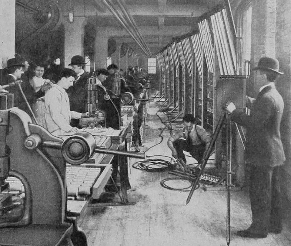 The caption of the photo above: “Making Moving Pictures in the Larkin Factories. The Mercury Vapor Lamps are Shown Along the Wall.”