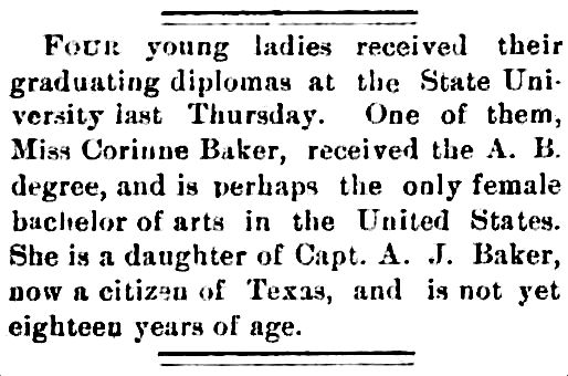 A quick look to see what I could find out about Miss Baker (1869-1961) turned up the fact that, in 1886, she was the first woman to both complete four-years of college coursework and receive a Bachelor of Arts degree from a “male” college in the South — in this case, the University of Mississippi. And she could pull off a kooky ensemble with a certain awkward grace.