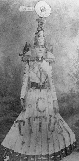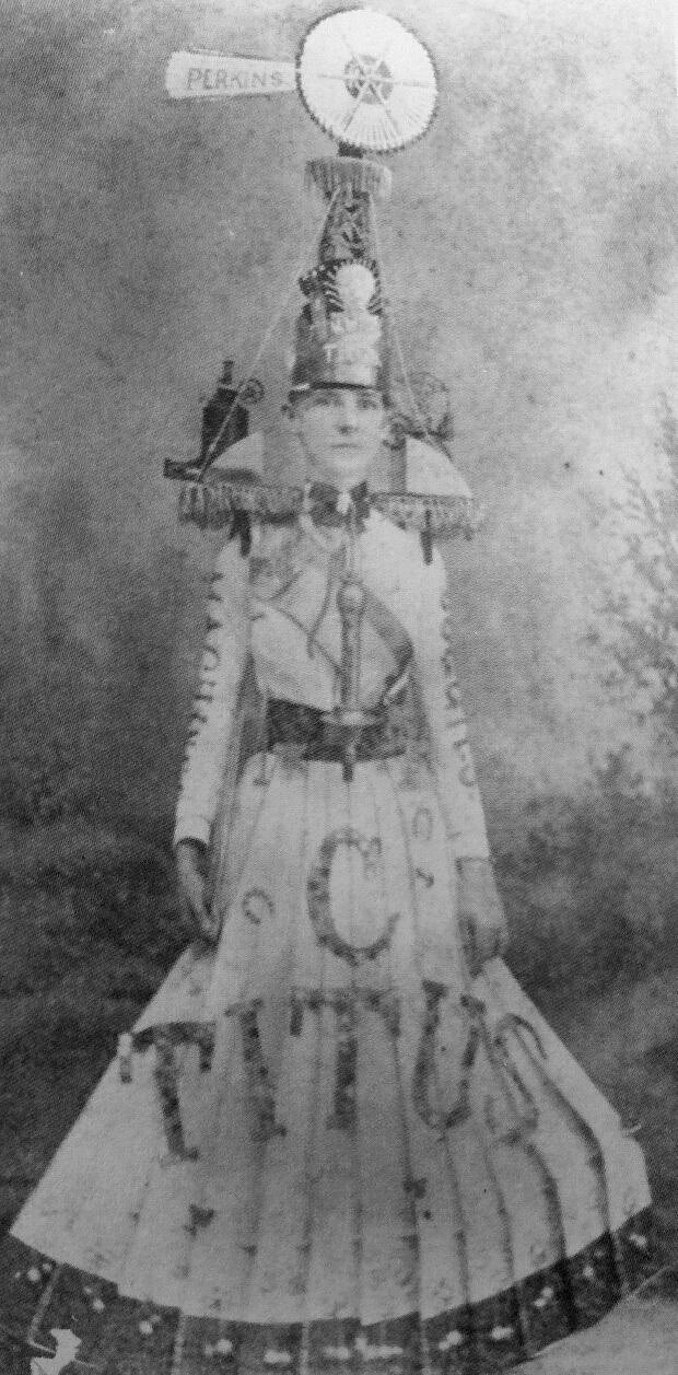 Above, Miss Corinne Baker of San Angelo, Texas, wears a promotional windmill dress, advertising the Perkins Wind Mill Co. (of Mishawaka, Indiana) and C. Titus, a Texas agent. This is pretty spectacular. The skirt made of blades is great. (See this photo larger here.)