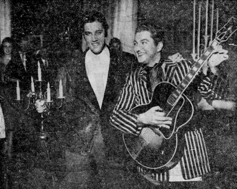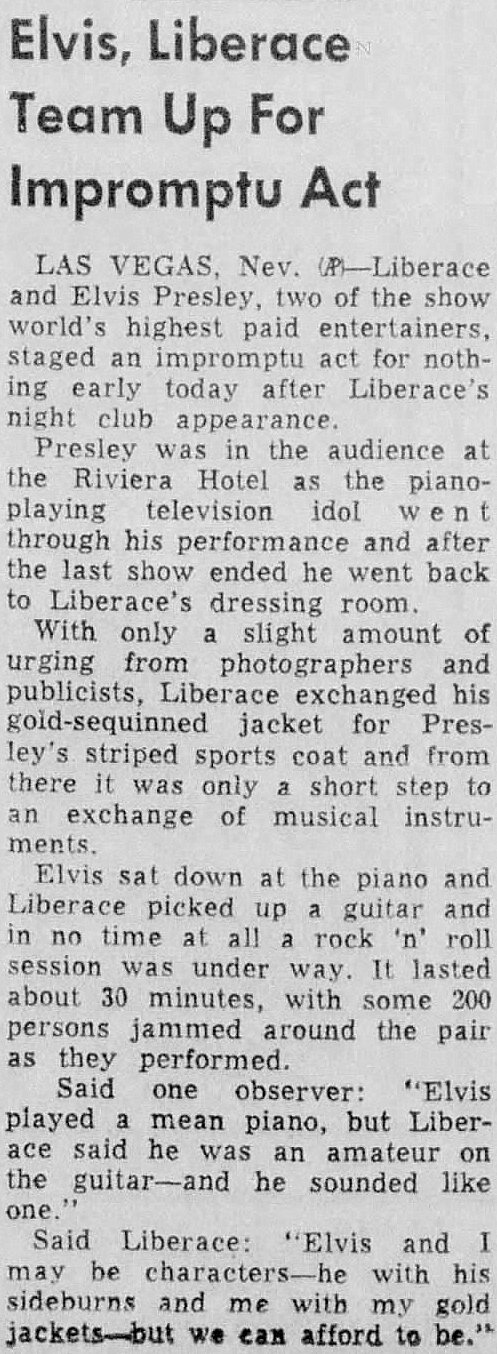 Elvis’ April run had been a dud, but it must have been an incredible boost for him to have had a visit from Las Vegas’ most famous showman. Between that first Vegas appearance and his return (just a few short months later, in November) he had wowed the nation on The Ed Sullivan Show and had become a bona fide, full-blown national sensation. Again, Elvis and Liberace hobnobbed and mugged for the cameras, going so far as to wear each other’s jackets and play each other’s instruments. The photo at the top shows the “impromptu jam session” with Elvis at the piano and Liberace gamely strumming Scotty Moore’s guitar. Elvis even clutched one of Lee’s famed candelabras while photographers snapped away. (In this striped jacked, Liberace has a faint Batman-villain look here — and, of course, he was a Batman villain!)