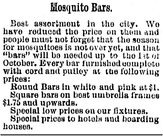 The “mosquito bar” — the human’s defense against blood-thirsty mosquitoes (and other annoying pests) — had its heyday in the US in the second half of the 19th century and the first couple of decades of the 20th century, before window and door screens were commonplace in American homes. They were particularly necessary in the hot and sweaty Southern US states which were routinely plagued with mosquitoes. A typical ad looked like this (click to see larger image):