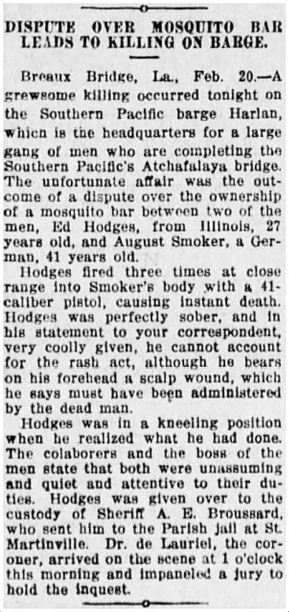 And if you don’t think that the prospect of a night without a mosquito bar (especially in the bayous of Louisiana…) wouldn’t inflame usually calmer heads, here’s a news story from 1910 about a man who shot a co-worker three times at close range because of a heated argument over which of them owned a mosquito bar. And this was in February! Lordy. Talk about your crime of passion. The moral of this story: do not mess with another man’s mosquito bar.