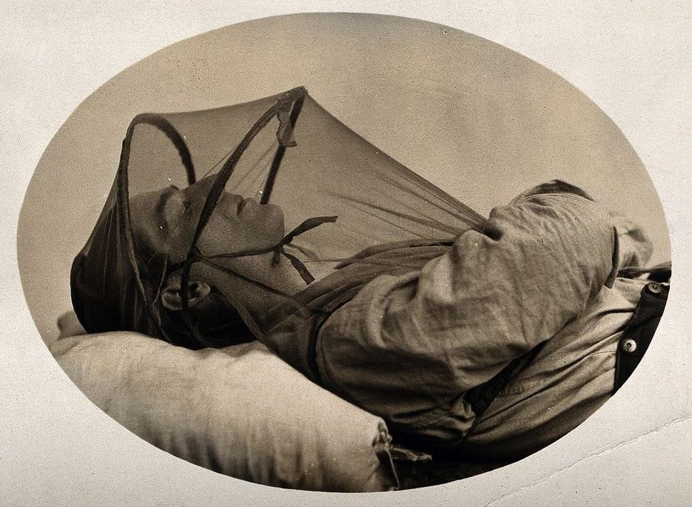 And here we see more “manly” uses of the mosquito bar — for men/soldiers who liked to be able to smoke their pipes while avoiding mosquital contact. To be worn with or without pith helmet.