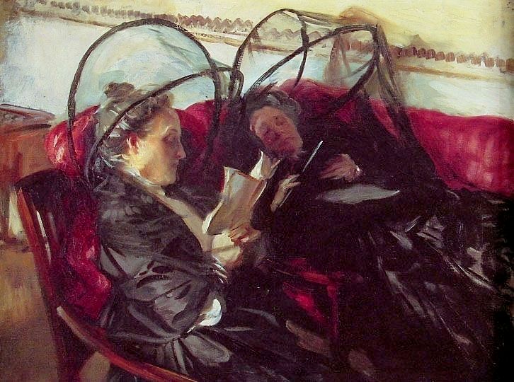 Mosquito bars were usually employed draped over beds, canopy-style, but the paintings above (1908) and below (1912) — both by John Singer Sargent — show “personal” net-covered armatures, perfect for genteel ladies to relax inside of and read (whilst trying to keep cool despite being weighed down by what must have been uncomfortably heavy clothing).