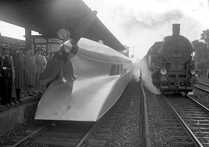 Developed in Germany in 1929 by Franz Kruckenberg, this streamlined aluminum locomotive — which had a propeller on the back and a BMW V12 engine under its hood (as it were) — was introduced in 1930. It got up to an impressive 143 mph in 1931 (setting the land speed record for a gasoline-powered locomotive), but this Schienenzeppelin (“Rail Zeppelin”) never made it beyond the prototype stage. When the Nazis came into power, the train was dismantled and, as WWII was looming on the horizon, it was presumably cannibalized for material to manufacture airplanes for the coming war.