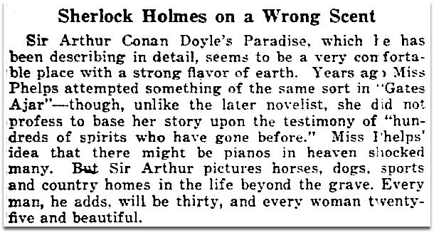 Read an interview with Doyle in a slightly fuzzy scan of the St. Louis Dispatch article “Conan Doyle Describes Spiritualist Heaven” (May 7, 1922) here.