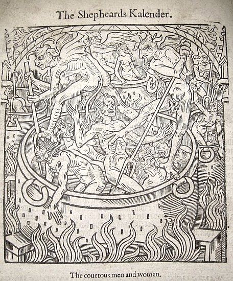 For several years I was a rare books cataloger. This illustration, from an edition of The Shepheards Kalender printed in 1517, jumped out at me (almost literally) when I turned a page and saw it. (See it larger here.) It depicts the terrifying punishment which awaits “covetous men and women” and is one of seven artistic representations of the tortures meted out to those whom indulge in one or more of the Deadly Sins, tortures vividly described by eye-witness Lazarus, newly risen from the dead: