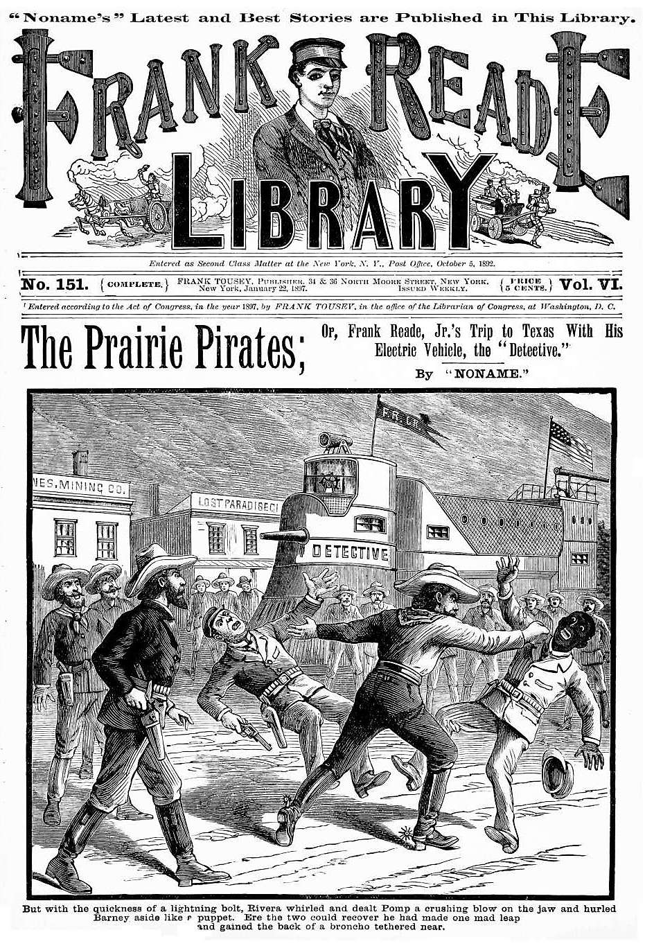 The cover of the Jan. 22, 1897 issue of Frank Reade Library magazine is from the Comic Book Plus website, here. This site also has a huge number of scanned comic books (etc.) — the homepage is here.