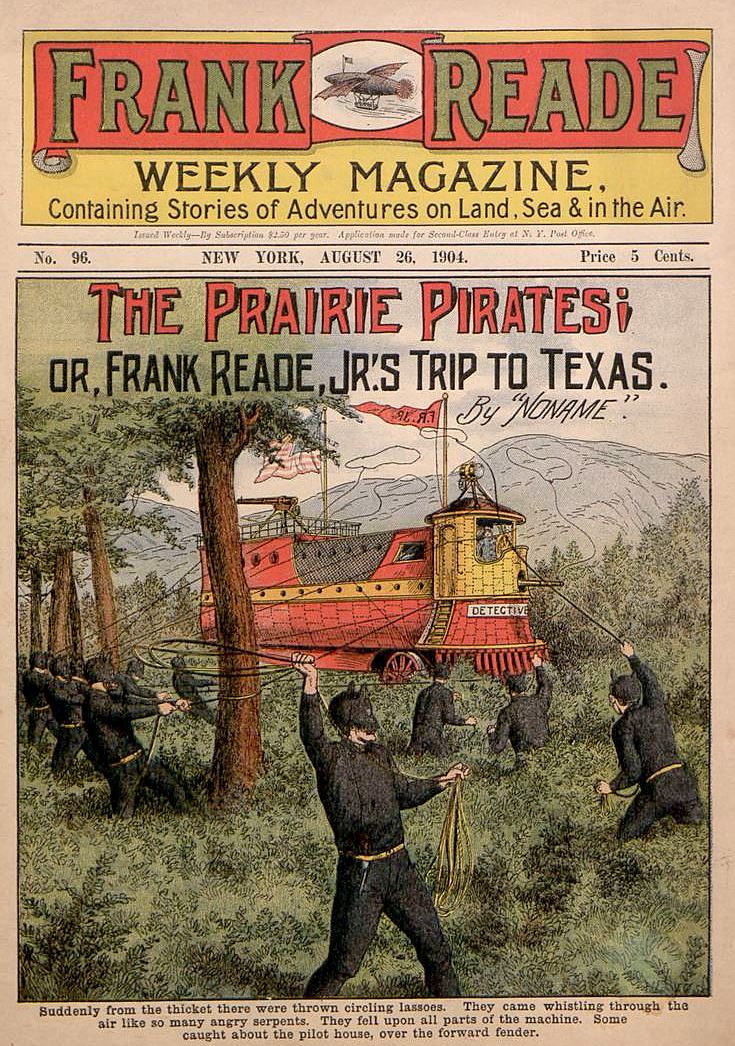 This is the cover art for Frank Reade Weekly Magazine, a magazine for boys “containing stories of adventures on land, sea and in the air.” And this one — “The Prairie Pirates; or, Frank Reade, Jr.’s Trip to Texas” — is a sort of science-fiction-y story which one might think of as “steampunk” except the inanimate star of this rousing tale is powered by electricity rather than steam.