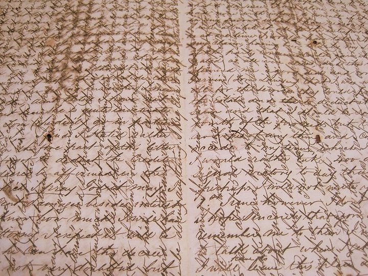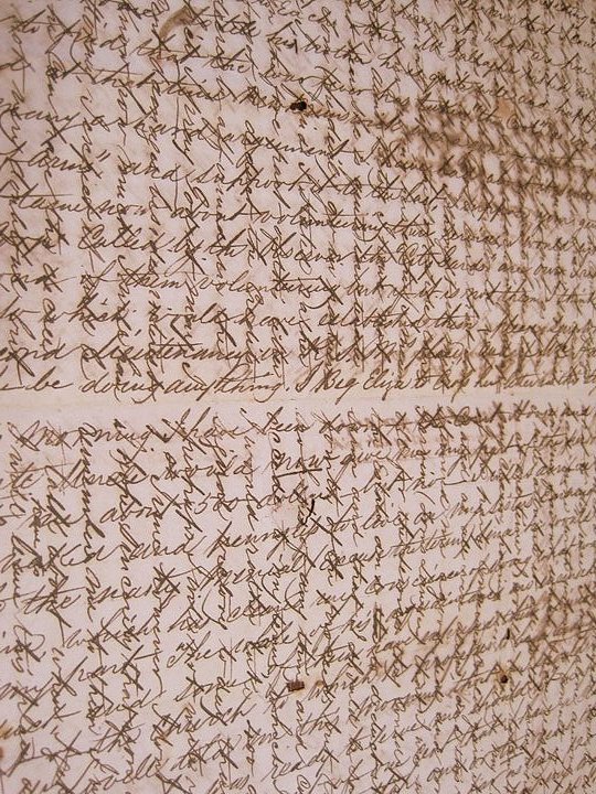 Years ago I worked in the Rare Books department of an auction house. We shared our workspace with the Manuscript department, and I was always amazed that those catalogers were able to decipher old handwriting. One day I was shown a Civil War-era letter with this crazy criss-cross writing. In order to save paper (and/or save on the cost of mailing a letter), people would write what began as a standard letter format, but when they reached the bottom of the page, they would turn the sheet a quarter-turn and continue the letter, writing on top of what they had just written. I’ve heard you can get used to reading something like this, but I think that if I ever received such a letter that the mounting anxiety which would wrap itself around me when attempting to actually read it would have caused me to fold the letter quietly and put it away, unread.