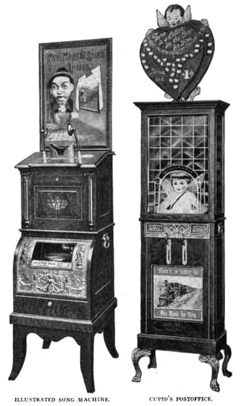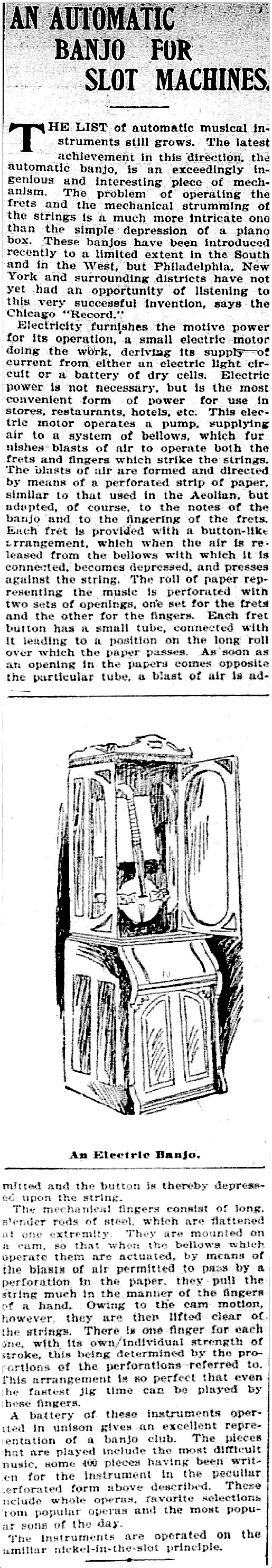 I’d never heard of coin-operated “banjo machines,” but they’ve been around since at least 1897 (read how they worked, in an Aug. 21, 1898 article from The Pittsburgh Post, here). This Electric Banjo machine (from the Western Automatic Banjo Company of Chicago) was one of many such machines on the market (there’s a whole page on these things, here). “You cannot invest your money to better advantage.” (See one of these machines in action here.)