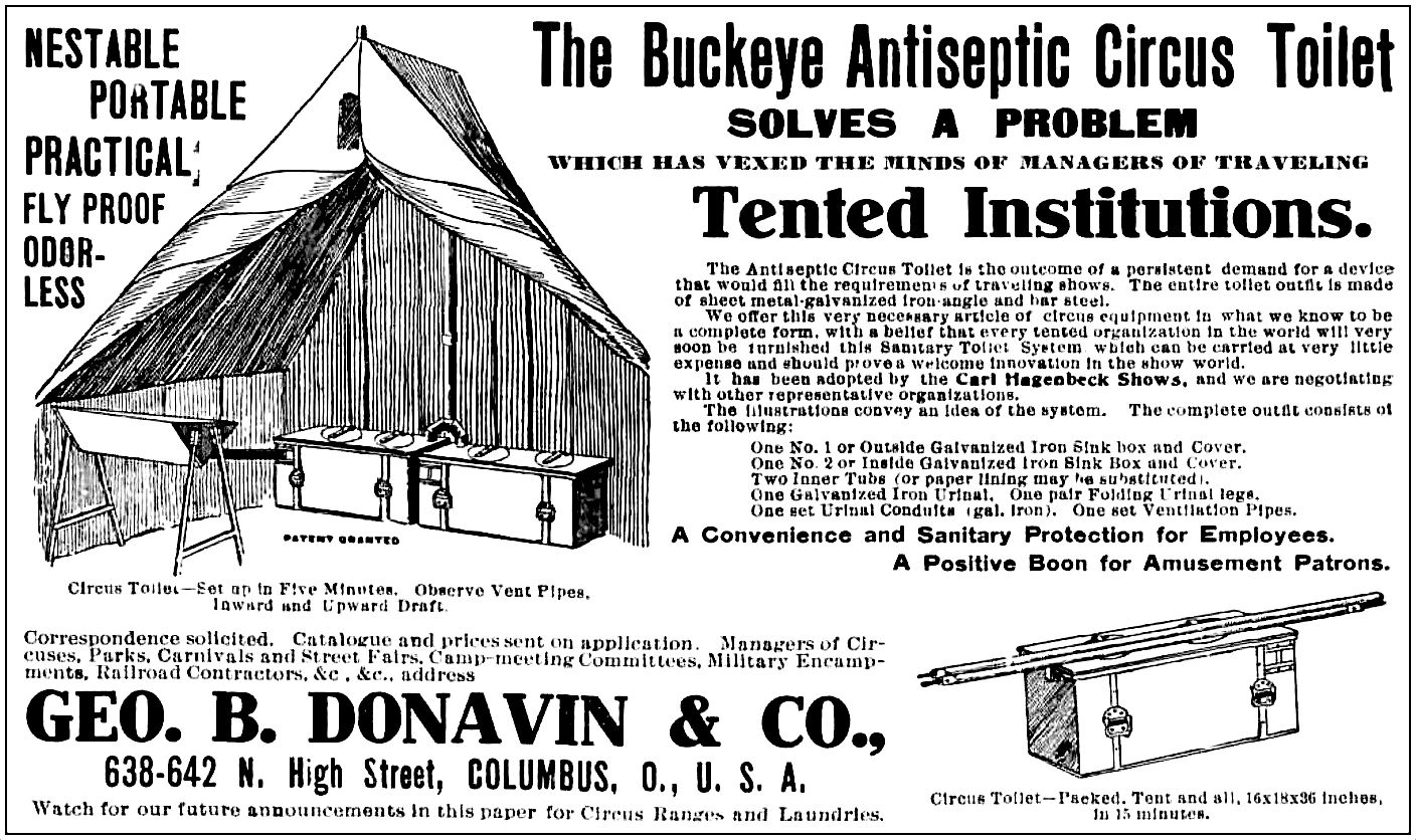 The Buckeye Antiseptic Circus Toilet: “nestable, portable, practical, fly proof, odorless…. Solves a problem.” This is really interesting — and the kind of thing one rarely considers. Click the ad to read the very informative text.
