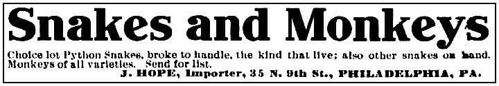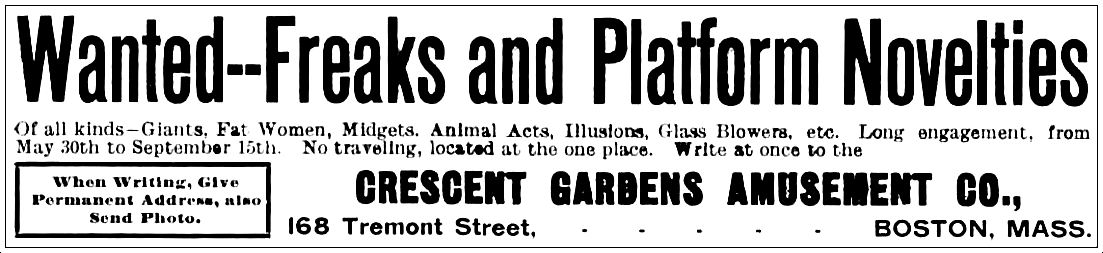 “Wanted–freaks and platform novelties of all kinds–Giants, Fat Women, Midgets, Animal Acts, Illusions, Glass Blowers, etc.” (Personally, I’d like to see all of these acts onstage at the same time — doing whatever it was they did.)