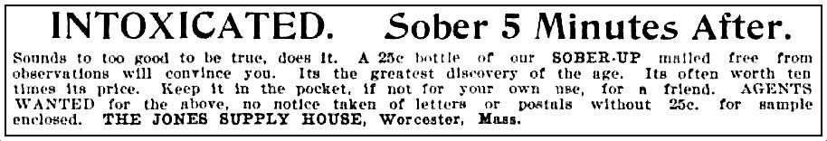Drunk? Need to not be drunk? A swig of “Sober-Up” (“the greatest discovery of the age”) (later to be eclipsed by the aforementioned penicillin…) will snap you right back to sobriety.