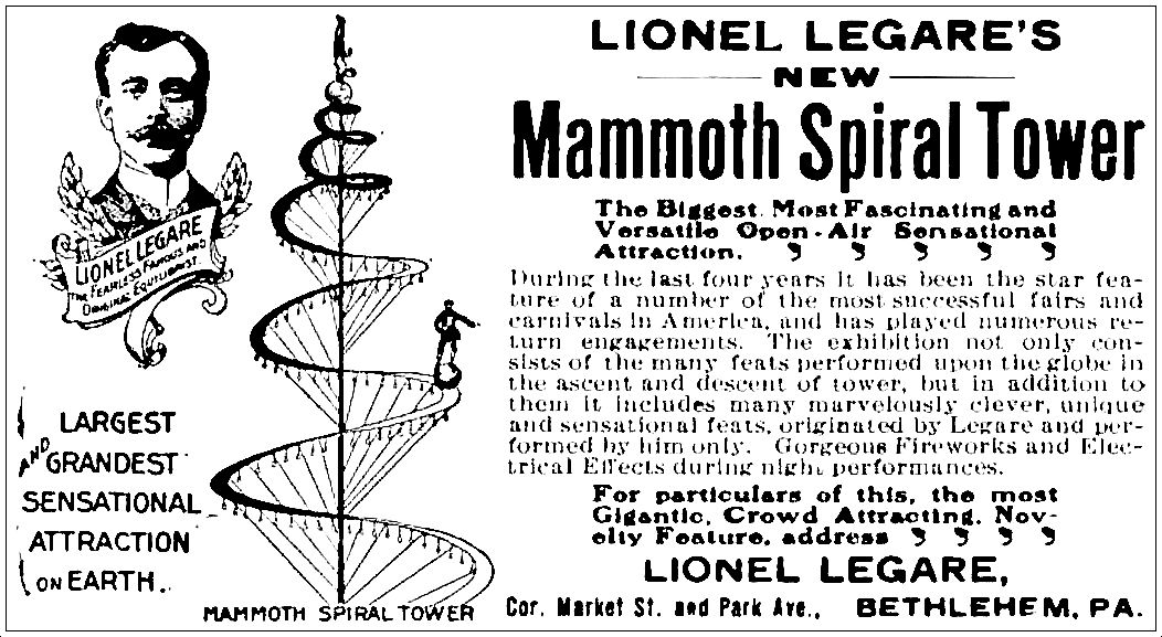 Here’s an eye-catching ad: Lionel Legare and his Mammoth Spiral Tower — the “Largest and grandest sensational attraction on earth.” I have to admit, I’d be curious to see Mr. Legare, “the fearless, famous, and original equilibrist” in action, but the star of the show seems to be that fantastic tower, which, at night, was festooned with electric lights and had fireworks exploding above it. (See photos of Lionel at work, with a description of just what it was he did, here.)