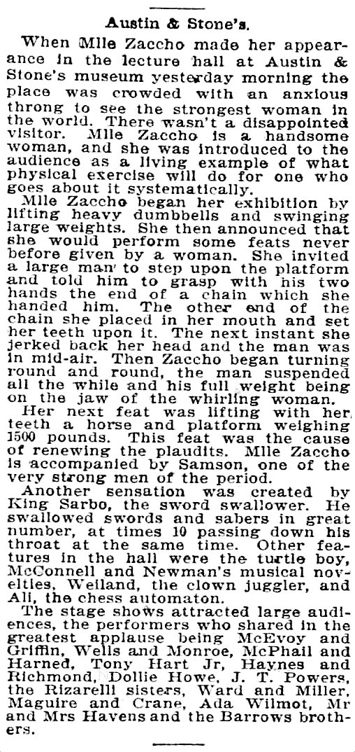 “Mlle. Zaccho, who is known on the vaudeville stage as the world’s greatest strong woman, is, in conjunction with Samson, appearing in a wonderful act […] in which she lifts an upright piano and player, a combined weight of 1,100 pounds, with her teeth. Mlle. Zaccho has met with great success in the west. She is now coming east and will appear on the leading vaudeville circuits.” It might be worth your time to read about Mlle. Zaccho’s act — here, in a review from The Boston Globe (July 28, 1896).