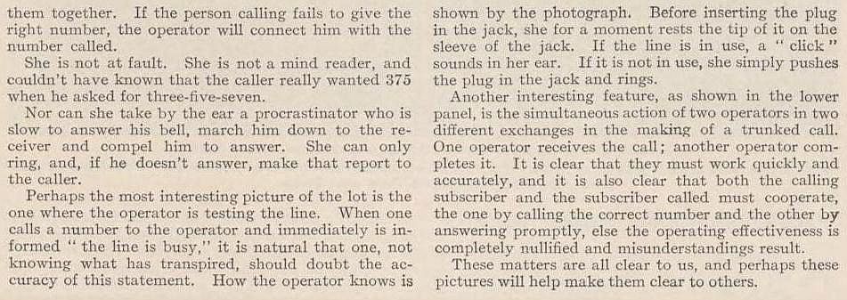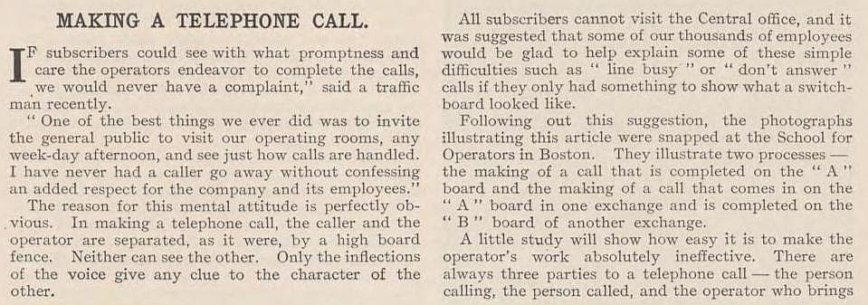Text and photos from the January, 1911 issue of the trade publication New England Telephone Topics. As stated in the article, the photographs were taken at the School For Operating in Boston.