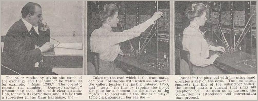 I have a lot of weird interests — one of them is a fascination with telephone switchboards. I’ve never really known how they worked, back in the days when operators had to assist with all calls, completing them by plugging things (“plugs”) into holes (“jacks”) in a large board filled with lots and lots of holes. How did they possibly know where those plugs went? This photo essay from the January, 1911 issue of New England Telephone Topics is very helpful. (All images are larger when clicked.)