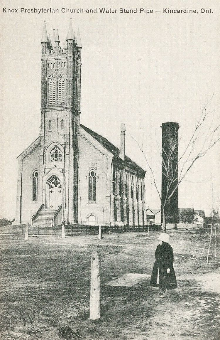 Kincardine, Ontario, Canada — a wonderfully atmospheric photo showing a dark stand pipe next to the Knox Presbyterian Church.
