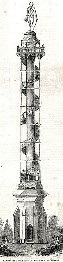 Philadelphia, Pennsylvania — here’s an interesting drawing showing a Philadelphia Water Works stand pipe from 1853, originally envisioned with a 16-foot statue of George Washington perched on top (more on this cool-looking tower in an interesting article by Ken Finkel on the Philly History Blog, here).