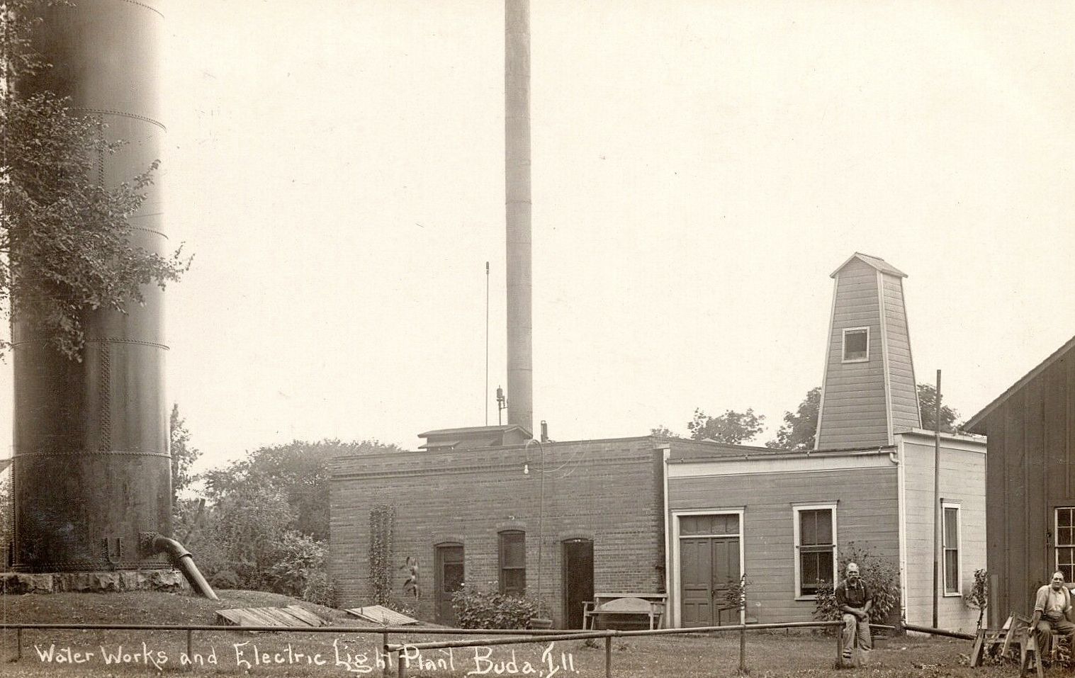 Below, Buda, Illinois — Water Works and Electric Light Plant (from a postcard postmarked 1909).