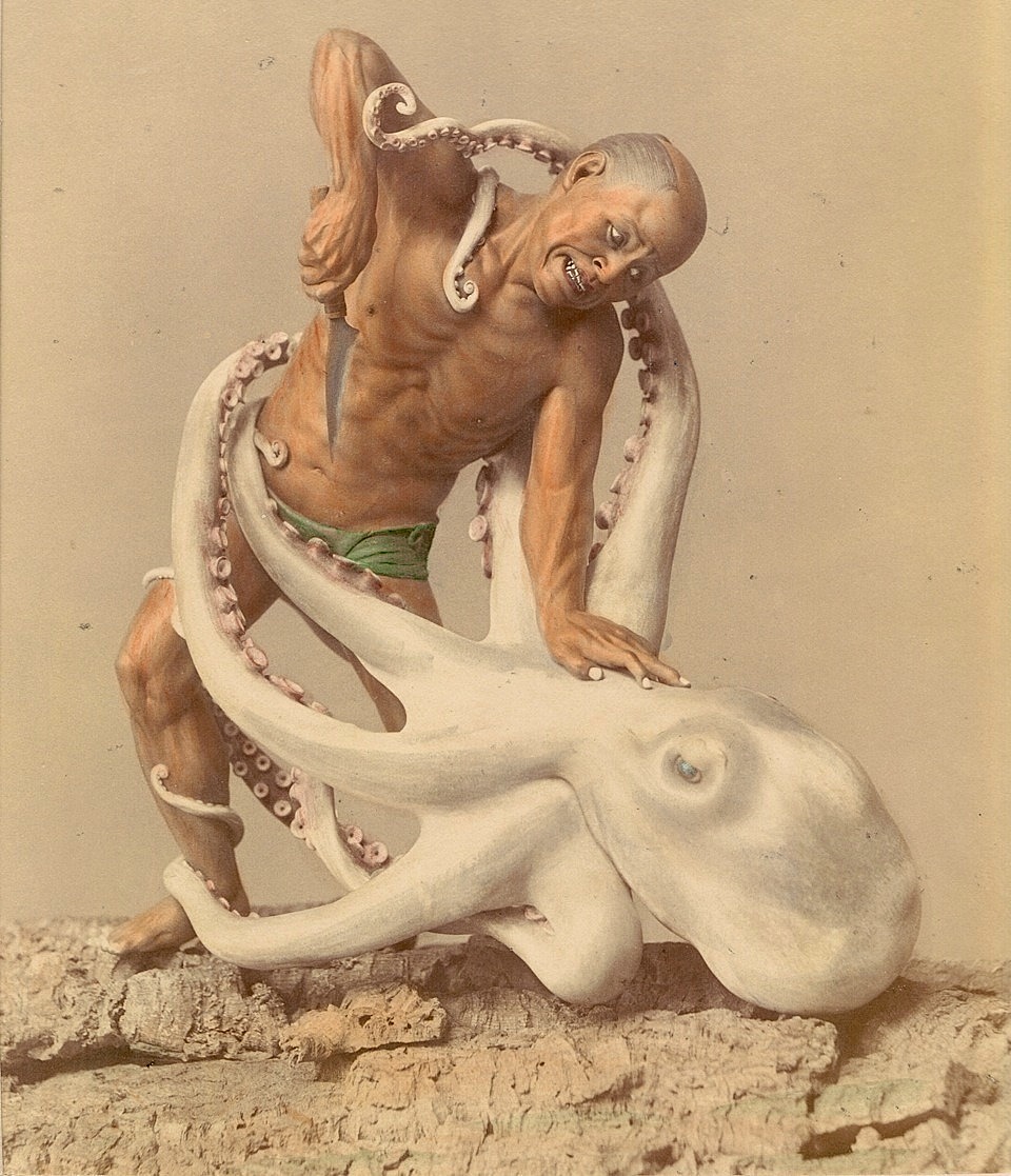 Years ago, when I worked for an auction house as a rare books cataloger, I came across this image in a multi-volume collection of Japanese photographs published in the United States in the 1890s. The photos, most of which had been hand-colored, were all stunningly beautiful, but, understandably, this fantastic image was the one that really grabbed my attention. The photograph — by Japanese photographer Kimbei Kusakabe (1841-1934) — shows a wood carving depicting a fisherman in a fierce battle with an octopus. My first thought (after “Whoa!”) was that this would make a perfect Christmas card if only the fisherman were wearing a Santa hat. …And maybe the octopus.