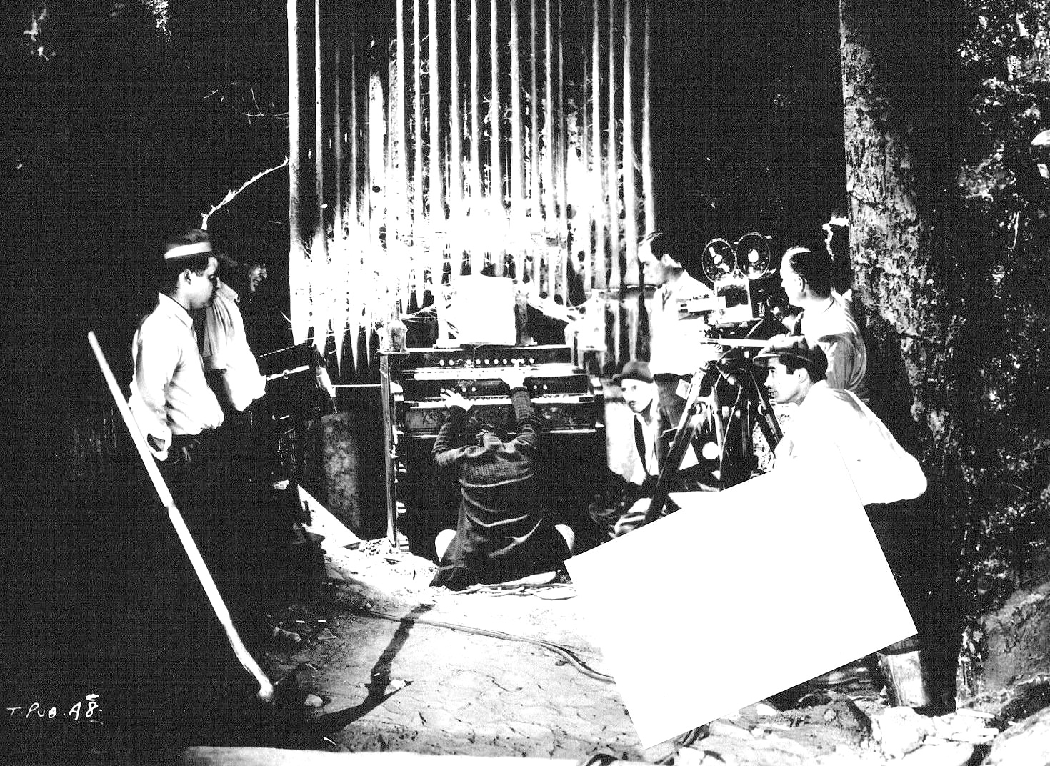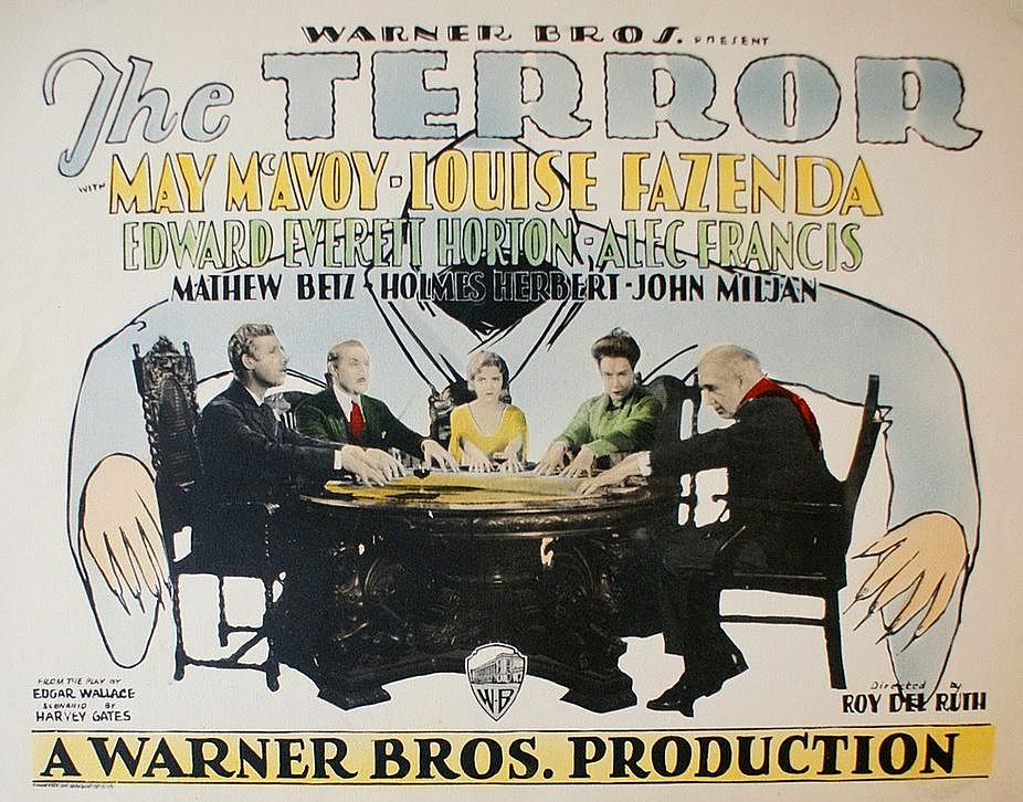 Top movie still is from the May, 1929 issue of the magazine Movie Makers. The caption for this photo reads, “Motion Creates a Focal Point. In this weird scene from The Terror with its many possibilities for diverting the eye, a clear understanding of good cinematics definitely establishes the hands of the hooded organist as the center of interest by limiting all motion to them. (Photograph by Warner Brothers)”