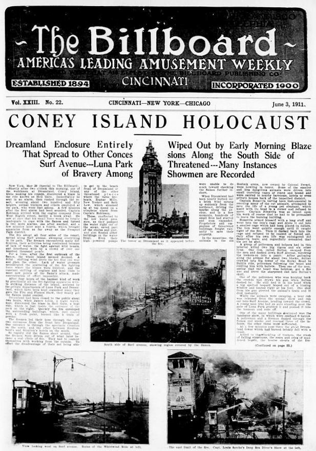 Disaster hit on the night of May 27, 1911. Billboard’s front page read: “CONEY ISLAND HOLOCAUST.” (Read the story in an Internet Archive scan, here.)