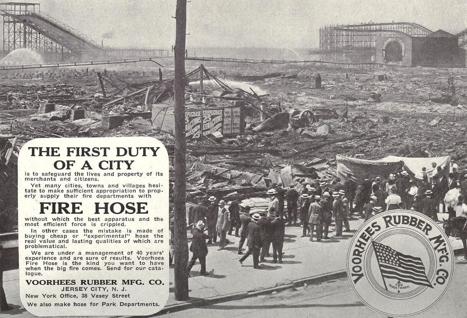 And, in no time at all, the Voorhees Rubber Mfg. Co. of Jersey City, New Jersey rushed into print their brilliantly opportunistic ad for fire hoses, using an Antietem-esque photo of the ruined Dreamland.